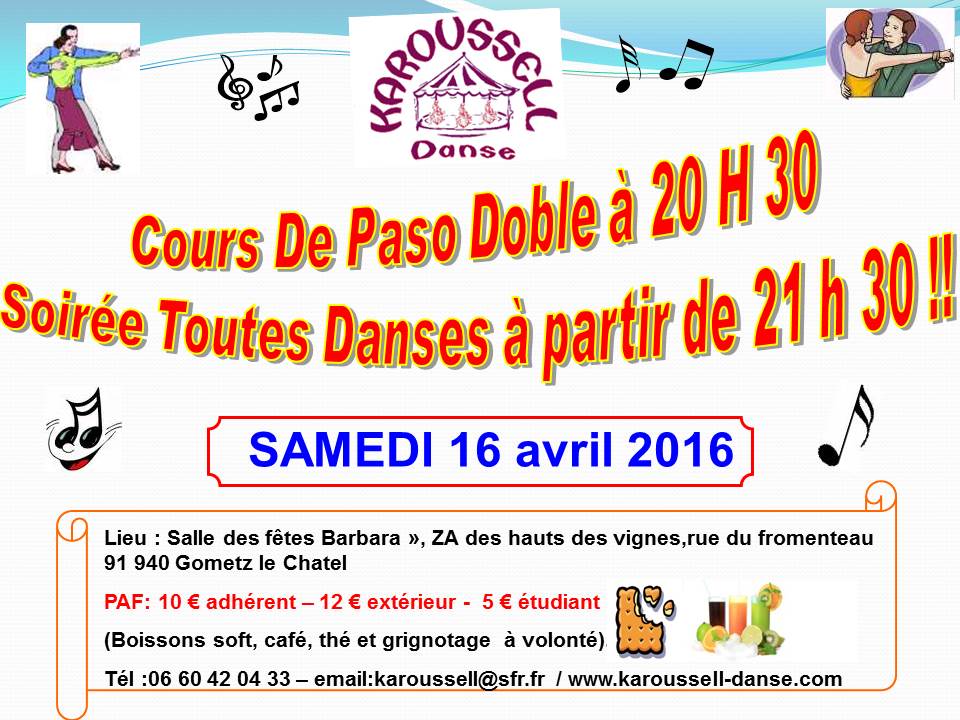 Samedi 16 avril, soirée toutes danses avec cours de paso doble à 20h30 !!